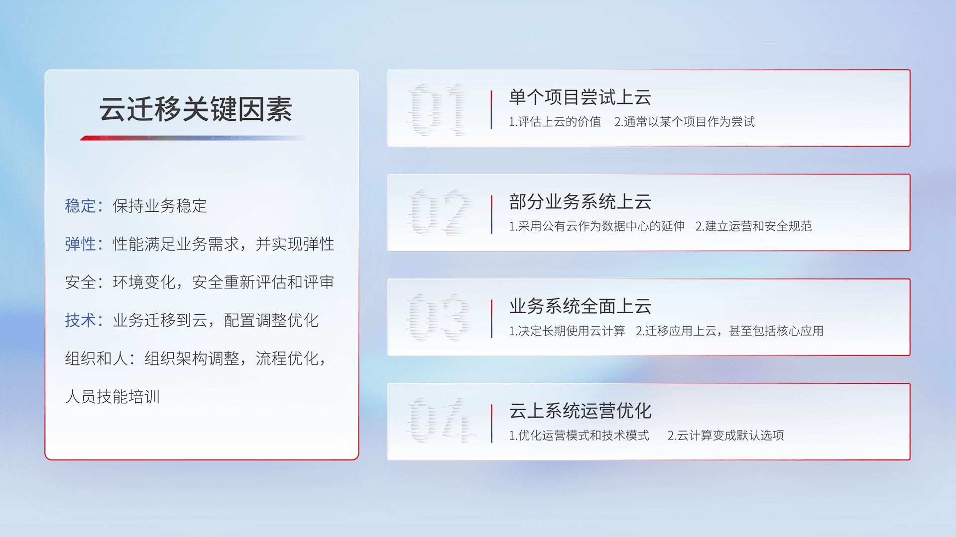 结合实际业务,,,从规划设计、、云平台选型、、、云原生改造、、、数据迁移、、、、集成交付,,,,迁移全过程为客户识别最佳上云路径,,做好风险识别管理,,,,设计网络架构、、、、身份权限、、、、安全审计合规、、、操作审计、、、日志审计、、、、监控告警策略、、多站点容灾设计等,,,对云上基础设施进行整体规划,,,,提升IT治理水平,,,,以满足弹性、、、、高可用、、高性能的需求。。