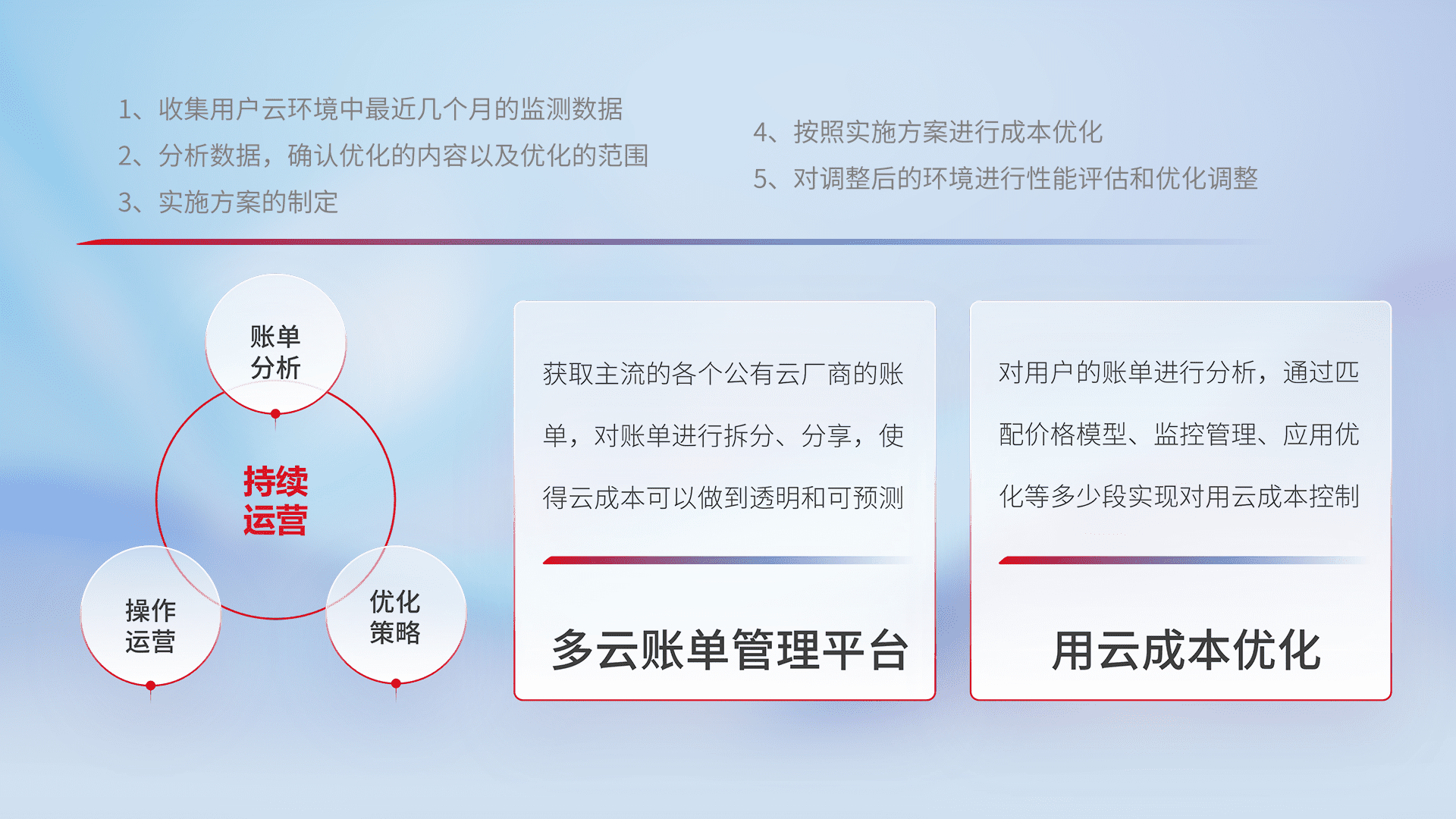 通过多云纳管,,,以统一的资源数据模型把客户的云资源进行抽象和封装,,,,进而实现对多云资源的统一操作,,,,保障云资源管理的可靠性、、、稳定性与可用性。。。量身定制化运维内容,,配置、、开发运维、、、补丁管理、、、、备份、、、、监控、、、、认证和访问管理、、、审计和日常巡检等,,,保障在用云过程中的可靠度,,稳定度以及高可用率。。。。